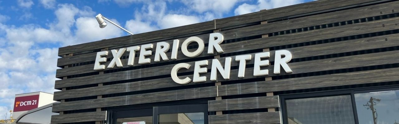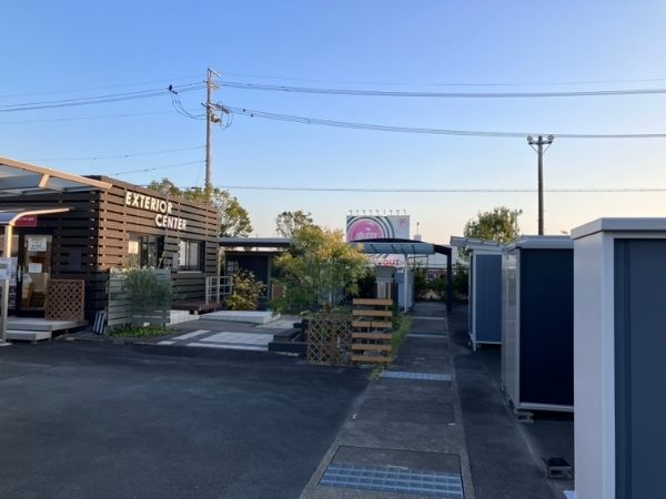 展示物置、「エクステリアセンター」の看板が